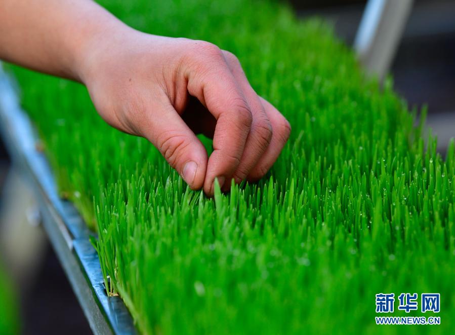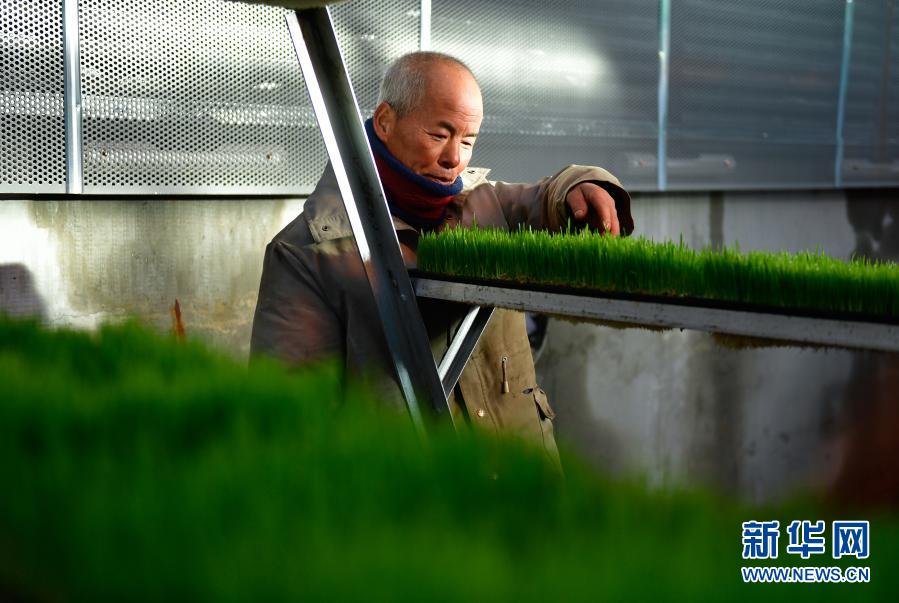 1月13日,在青海省果洛藏族自治州農(nóng)牧業(yè)生態(tài)科技示范園,工作人員在查看牧草生長情況。 新華社記者 張龍 攝