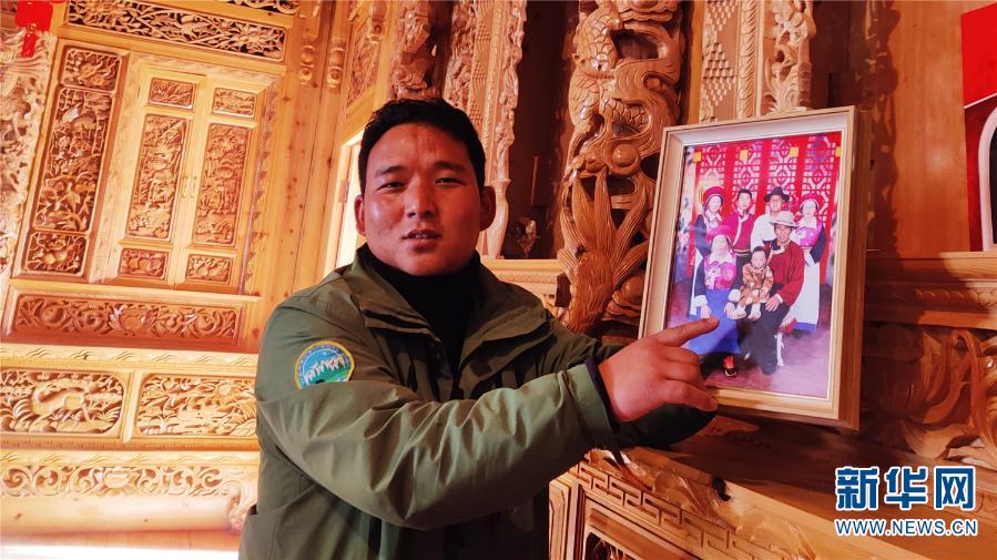 益西在向朋友展示全家福。新華社記者 嚴(yán)勇 攝