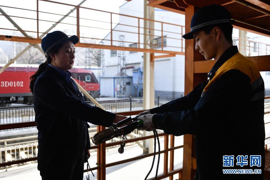 2月24日,在青藏鐵路公司西寧機(jī)務(wù)段整備車(chē)間,隔離開(kāi)關(guān)班組成員賀霞(左)在工作中。新華社記者 張龍 攝