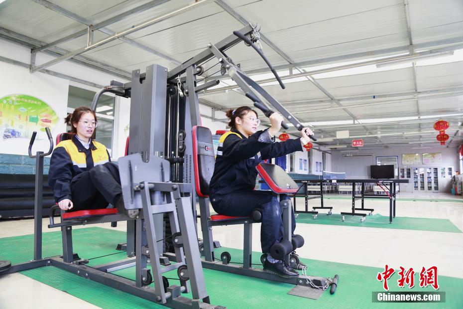 4月13日,青海省海北藏族自治州剛察縣,青藏鐵路公司西寧供電段哈爾蓋工區(qū),郭勝強(qiáng)(左)與羅露露一起健身鍛煉。中新社記者 馬銘言 攝