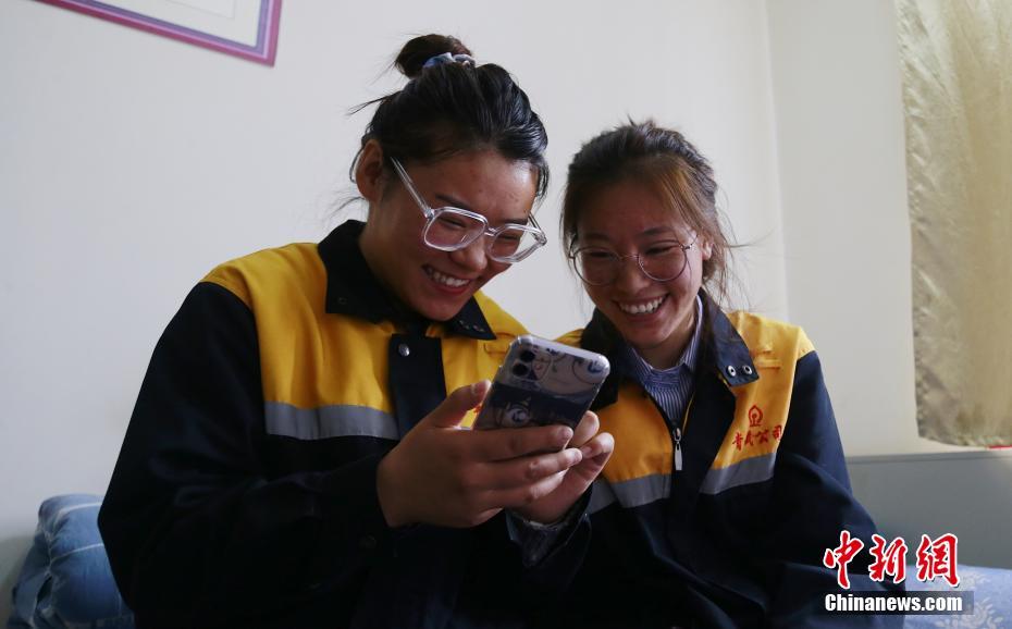 4月13日,青海省海北藏族自治州剛察縣,青藏鐵路公司西寧供電段哈爾蓋工區(qū)宿舍內(nèi),羅露露(左)與郭勝強(qiáng)在休息時(shí)間分享手機(jī)中的有趣內(nèi)容。中新社記者 馬銘言 攝