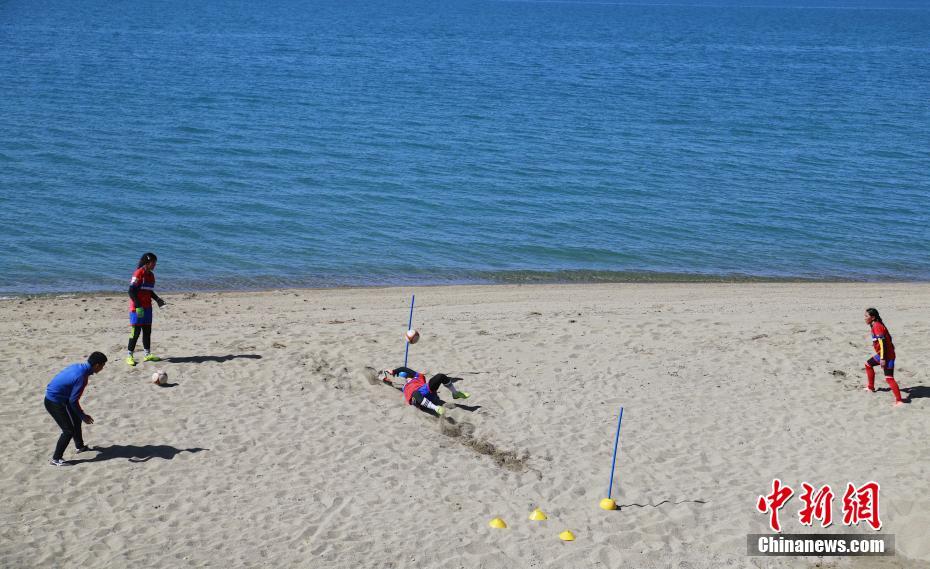 青海湖民族寄宿制學(xué)校女子足球隊(duì)的隊(duì)員們?cè)谇嗪:仙碁┥线M(jìn)行訓(xùn)練。中新社記者 馬銘言 攝