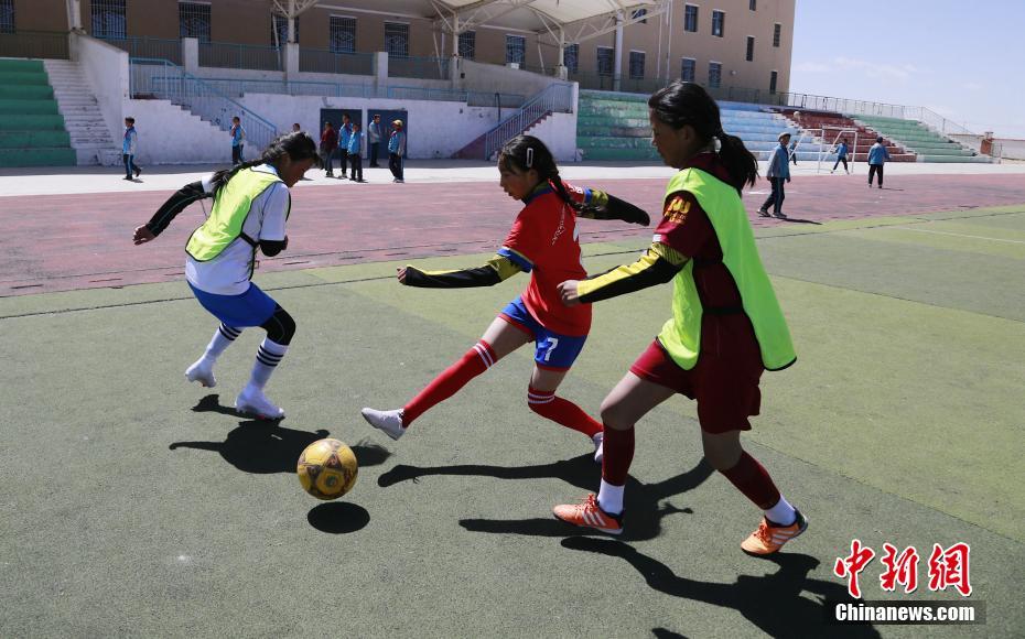 青海湖民族寄宿制學(xué)校的足球場(chǎng)上,女子足球隊(duì)的隊(duì)員們正在進(jìn)行跑步熱身。中新社記者 馬銘言 攝