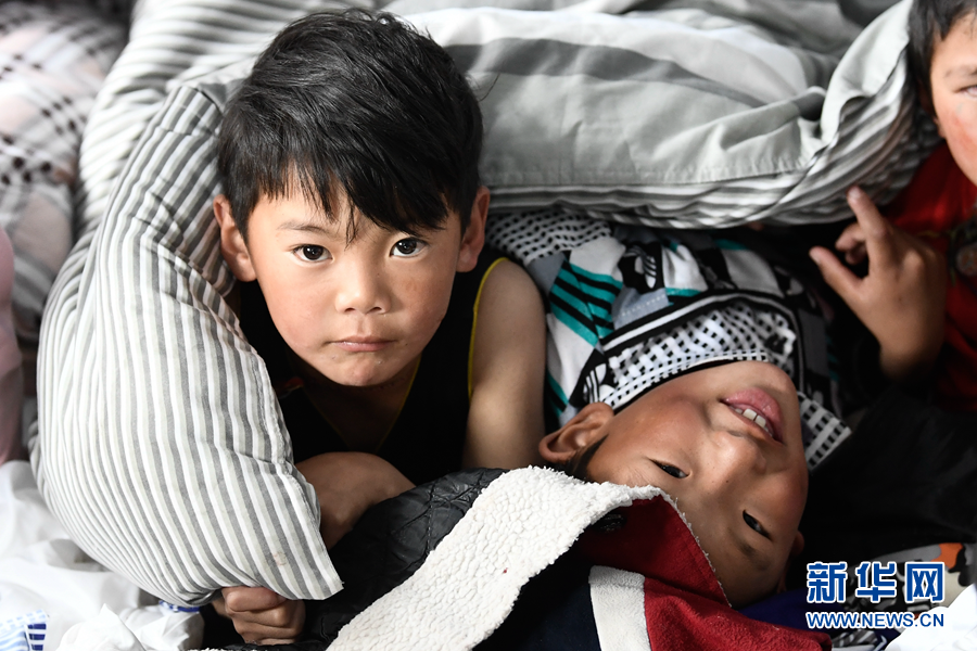 5月22日,在瑪多縣黃河鄉(xiāng)寄宿制學校救災安置點,孩子們在休息。新華社記者 張龍 攝