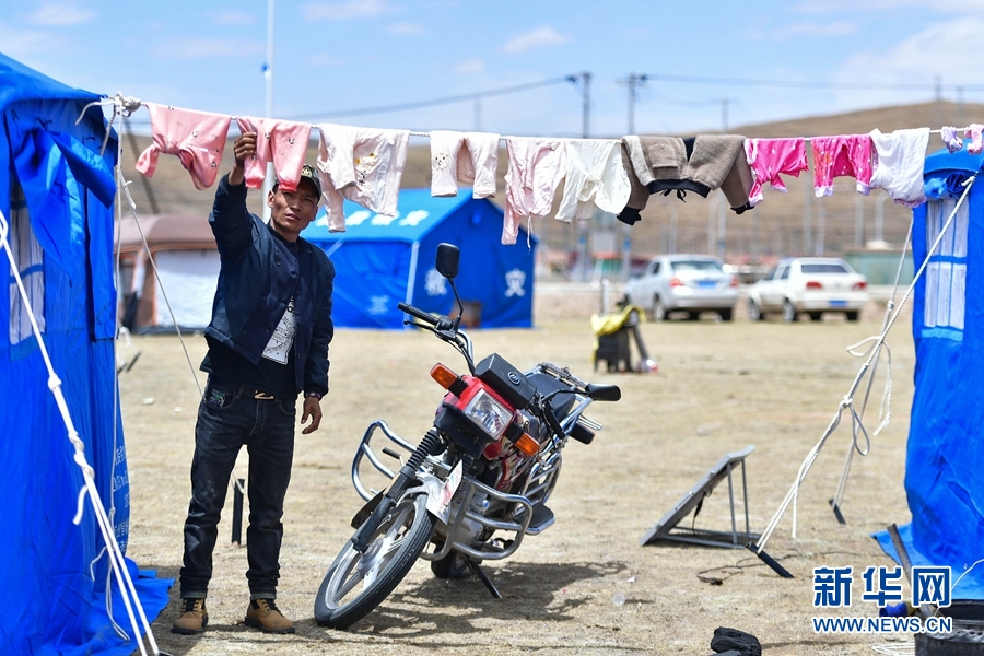5月26日,瑪查理鎮(zhèn)安置點內(nèi),一名受災(zāi)群眾正在晾曬衣物。
