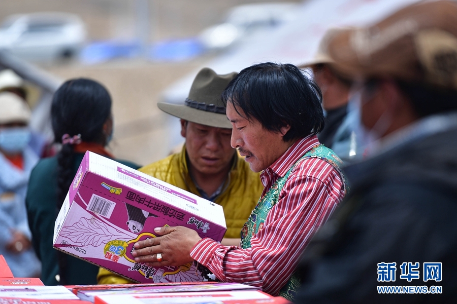 5月26日,瑪多縣扎陵湖鄉(xiāng)安置點內(nèi),受災(zāi)群眾在領(lǐng)取救災(zāi)物資。