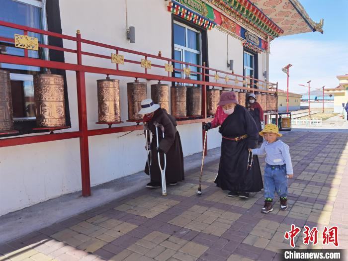 上午十點(diǎn),長(zhǎng)江源頭的青海玉樹(shù)治多縣幸福敬老院內(nèi),陽(yáng)光靜靜普照小廣場(chǎng),金色轉(zhuǎn)經(jīng)筒邊身著藏袍的老人彎腰拄拐,牽著吃糖的孩子悠悠踱步,遠(yuǎn)處皚皚雪山起伏。