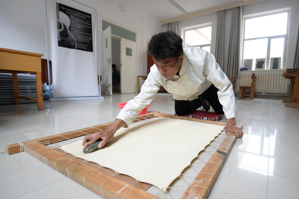 6月17日,在青海民族大學(xué)藝術(shù)學(xué)院,工藝美術(shù)(唐卡)專業(yè)學(xué)生在制作唐卡畫布。新華社記者 張龍 攝