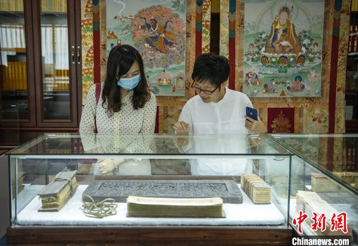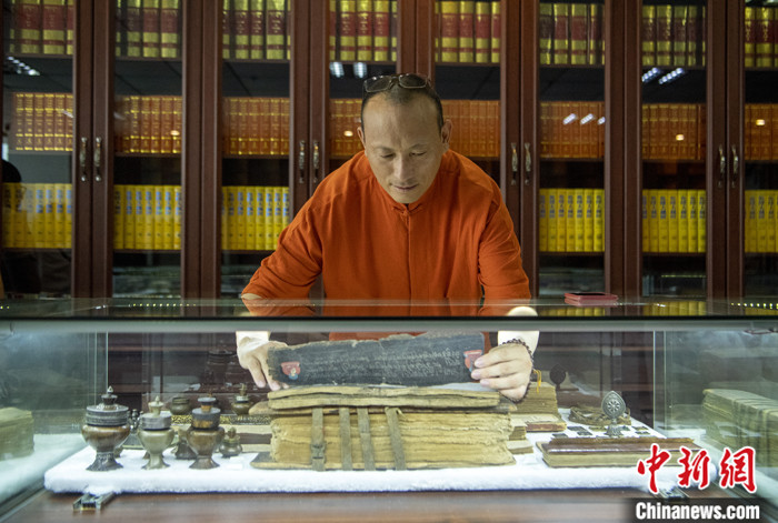 7月8日,四川成都,喜馬拉雅文庫(kù)總編輯才讓多吉在《格薩爾》資料中心整理館藏經(jīng)書(shū)。中新社記者 劉忠俊 攝