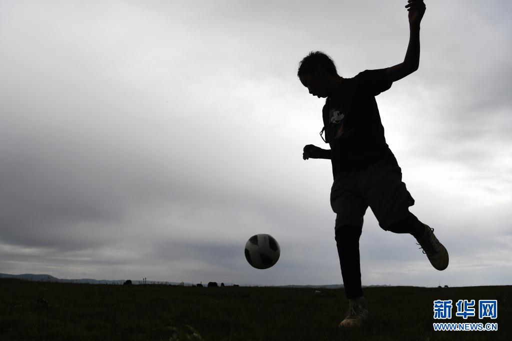 7月14日,河曲馬場(chǎng)小學(xué)的孩子在草原上踢足球。新華社記者 杜哲宇 攝