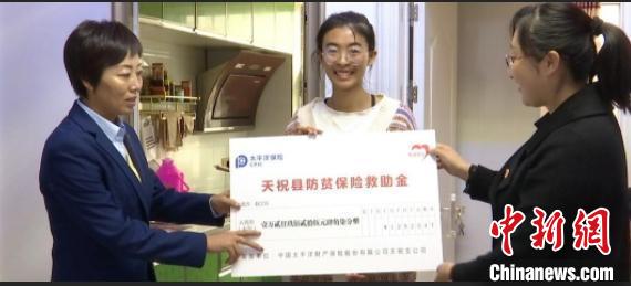 圖為天??h首批理賠的“防貧?!辟Y金到位。天??h委宣傳部供圖