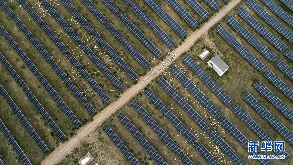 羊群在青海省海南藏族自治州共和縣光伏產(chǎn)業(yè)園吃草(2019年6月16日攝,無(wú)人機(jī)照片)。新華社 吳剛 攝