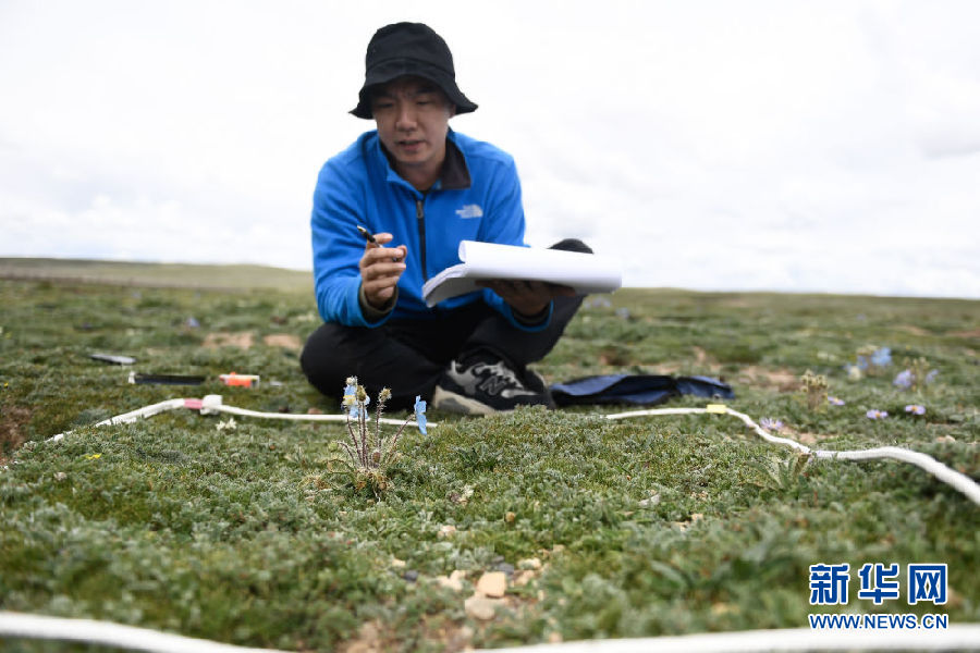 2021年長江源綜合科考的科考隊(duì)員任斐鵬在長江南源當(dāng)曲地區(qū)觀察高寒草甸(7月23日攝)。新華社記者 張龍 攝