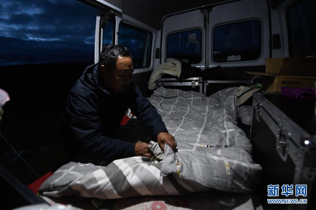 8月3日,在瑪沁縣當(dāng)洛鄉(xiāng)貢龍村的夏季草場(chǎng)上,南拉才讓在放映車中整理床鋪。每次到草原上放電影,南拉才讓都睡在車?yán)?。新華社記者 張龍 攝