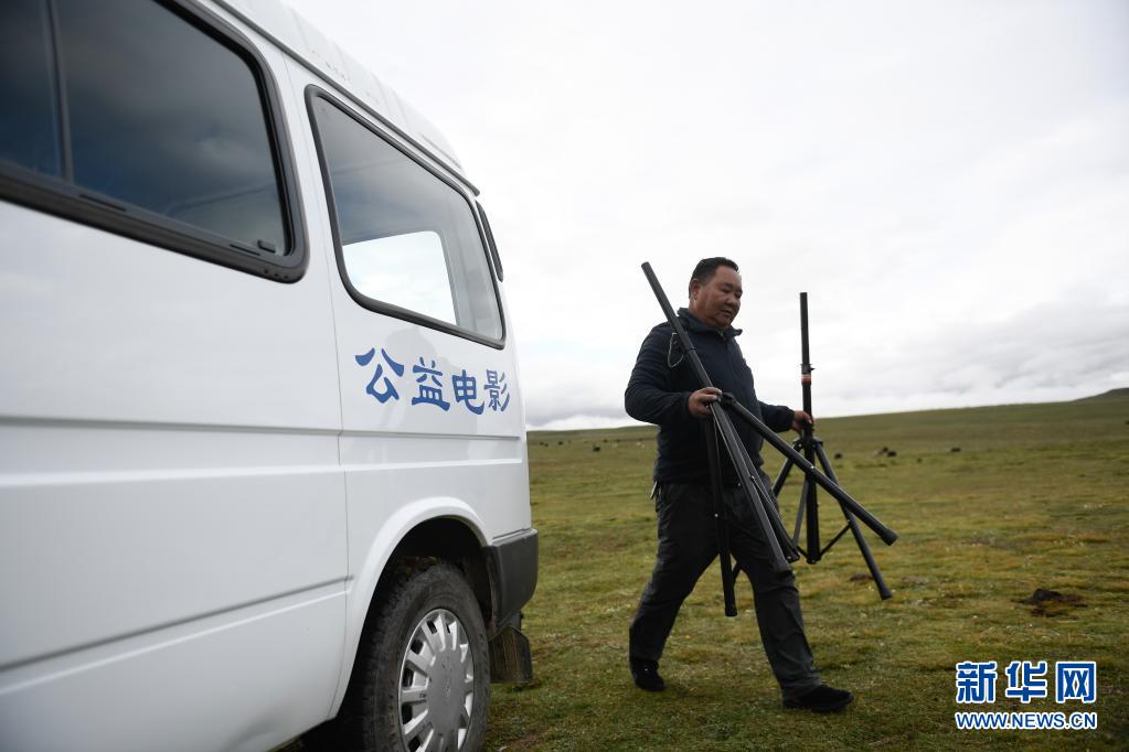 8月3日,在瑪沁縣當(dāng)洛鄉(xiāng)貢龍村的夏季草場(chǎng)上,南拉才讓為牧民放電影。新華社記者 張龍 攝