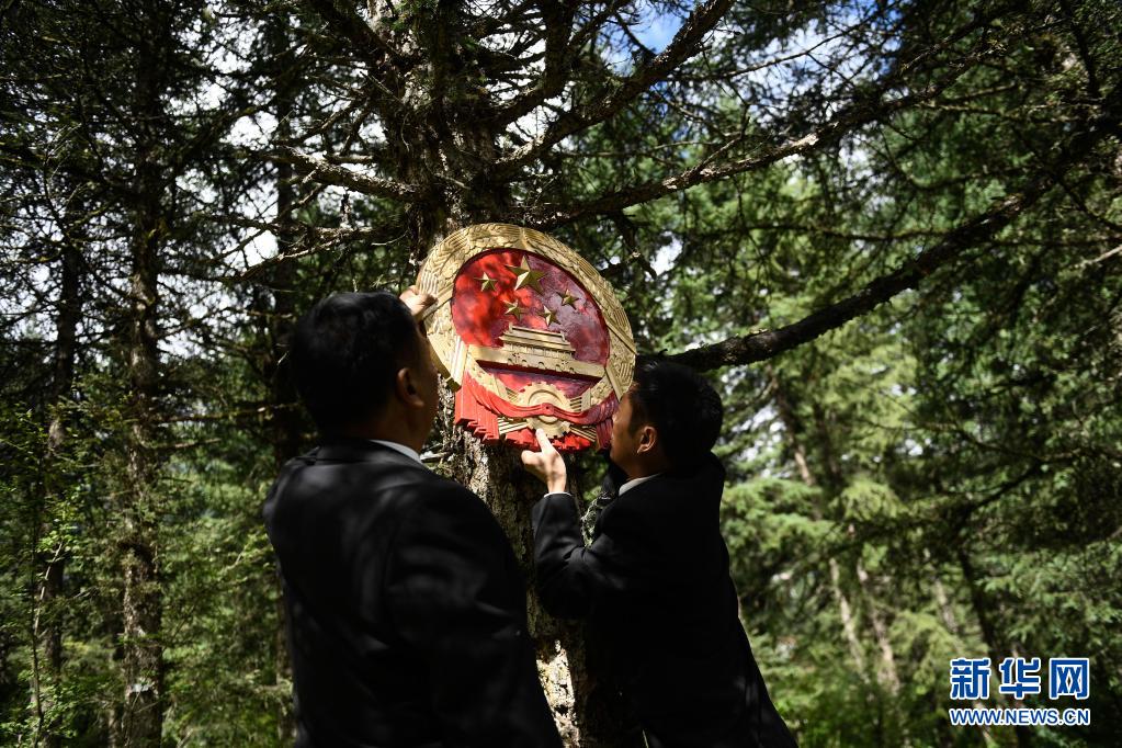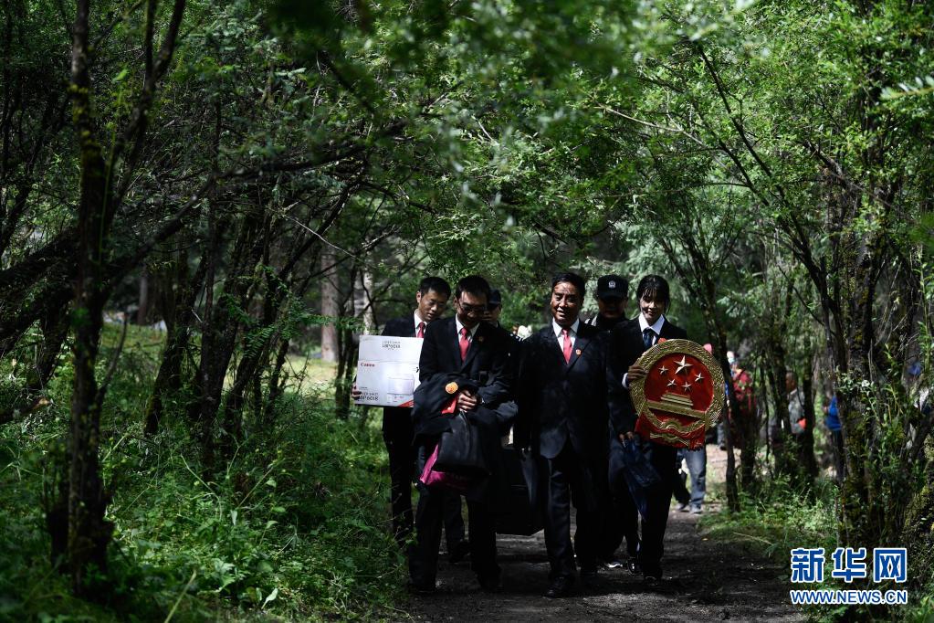 8月7日,班瑪縣人民法院工作人員在林區(qū)懸掛國徽,布設(shè)巡回法庭。新華社記者 張龍 攝