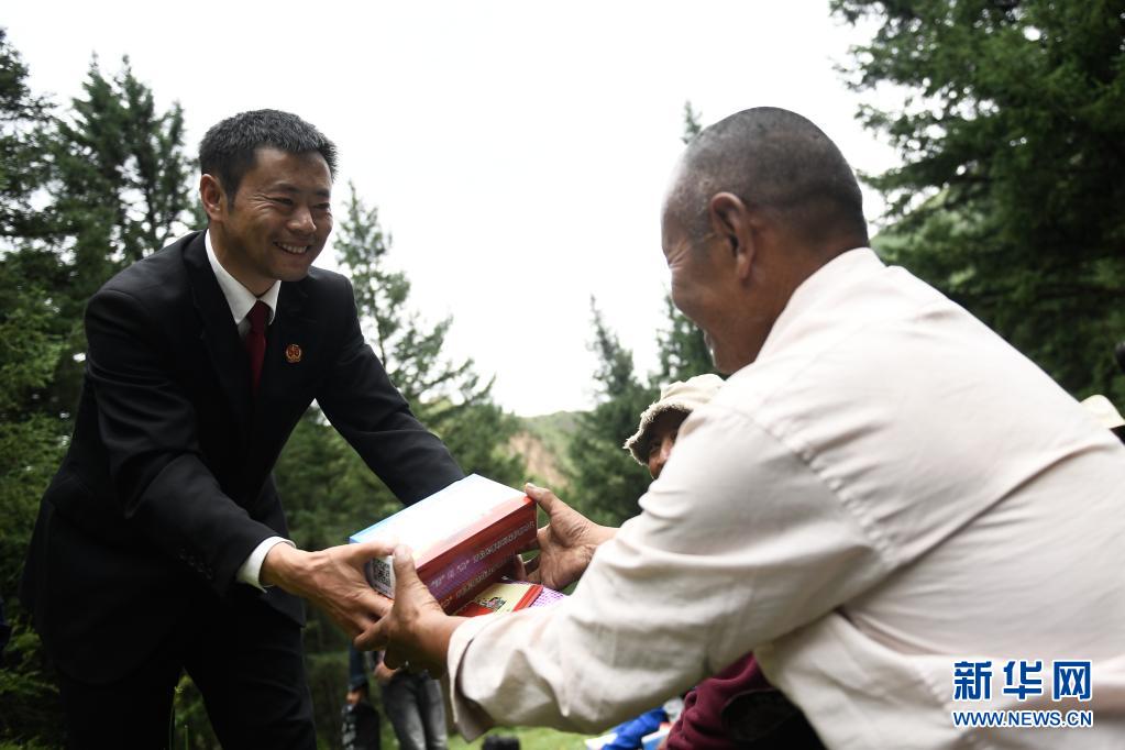 8月7日,班瑪縣人民法院工作人員向牧民發(fā)放法治宣傳資料。新華社記者 李占軼 攝