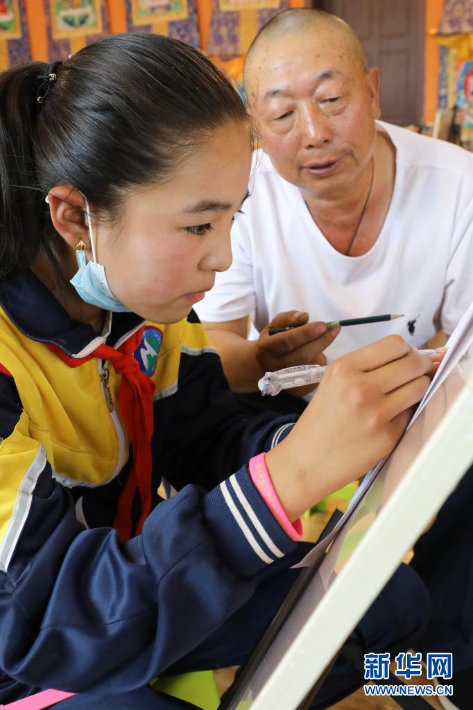 9月2日,黃南藏族自治州同仁市熱貢藝術(shù)完全小學(xué)六年級學(xué)生才讓央宗在唐卡繪畫老師旦巴的指導(dǎo)下畫畫。新華社記者 馬千里 攝