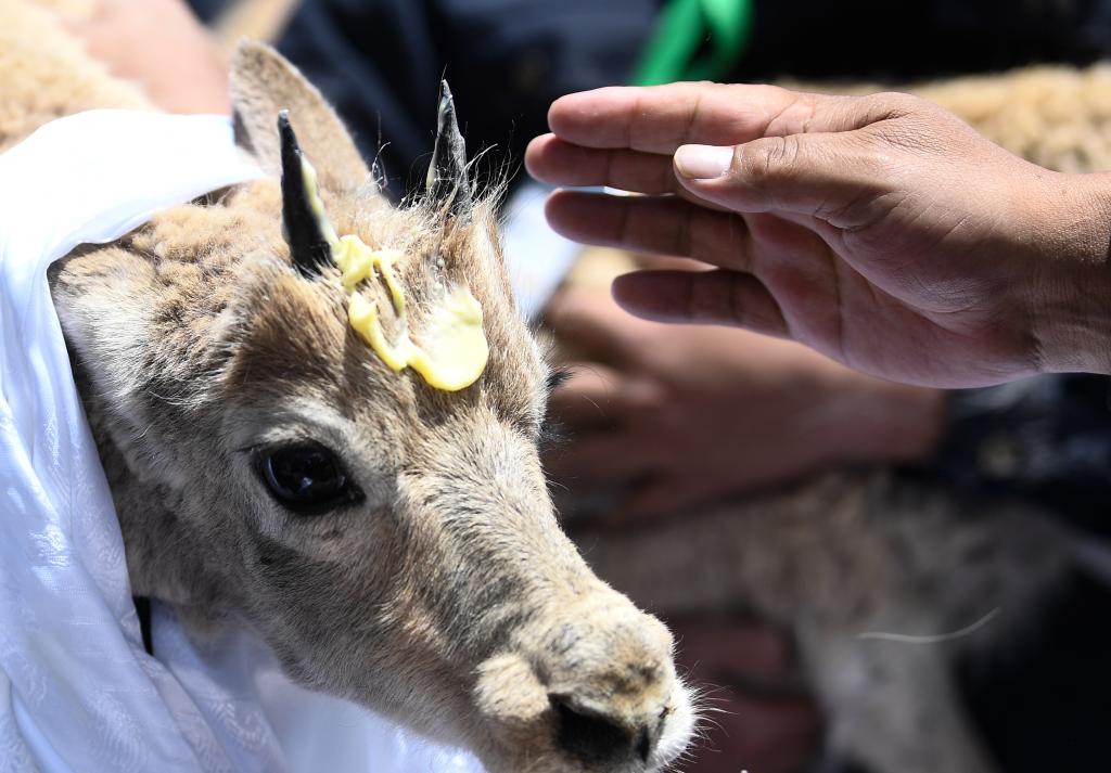 7月7日,在可可西里索南達杰保護站野生動物救助中心,可可西里巡山隊員按照風俗,在即將回歸大自然的藏羚羊額頭上涂抹酥油表達祝福。 新華社記者 張龍攝