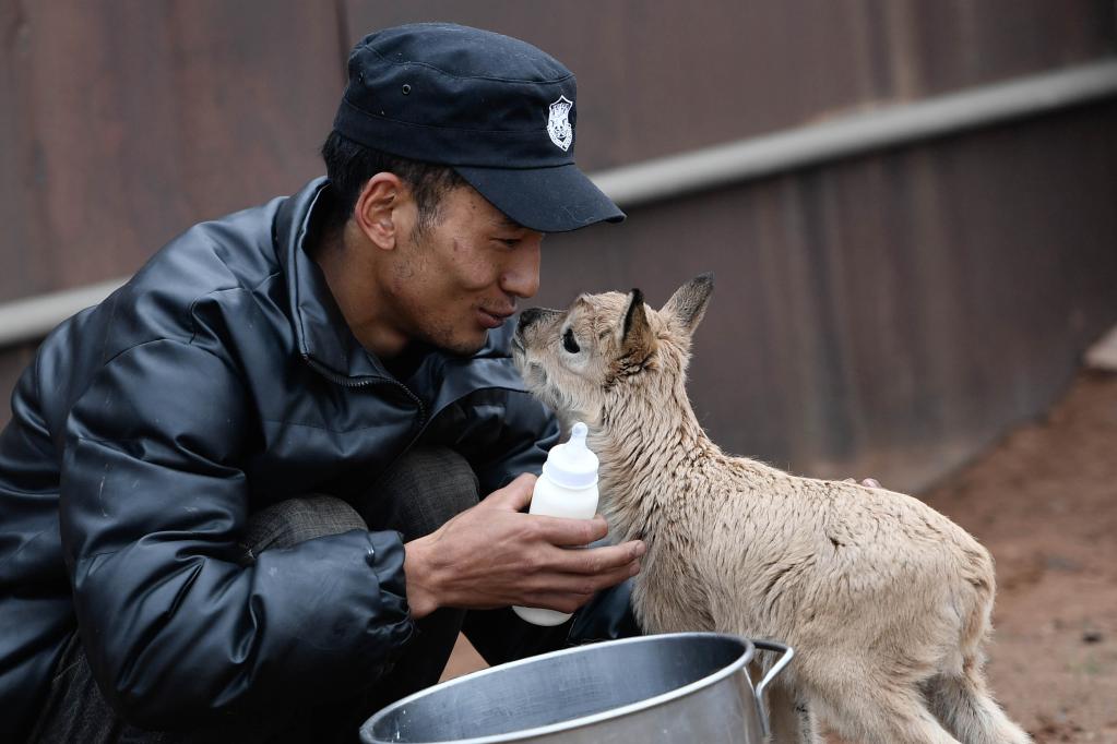 2020年7月8日,三江源國家公園管理局長江源園區(qū)可可西里管理處卓乃湖保護站的工作人員才文多杰在給一只藏羚羊幼仔喂奶。 新華社記者 張龍 攝