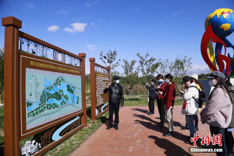 10月16日,青海省海南藏族自治州貴德縣蘆花灣水生態(tài)公園內(nèi),工作人員向記者們介紹該項目進展與成效。 中新社記者 馬銘言 攝