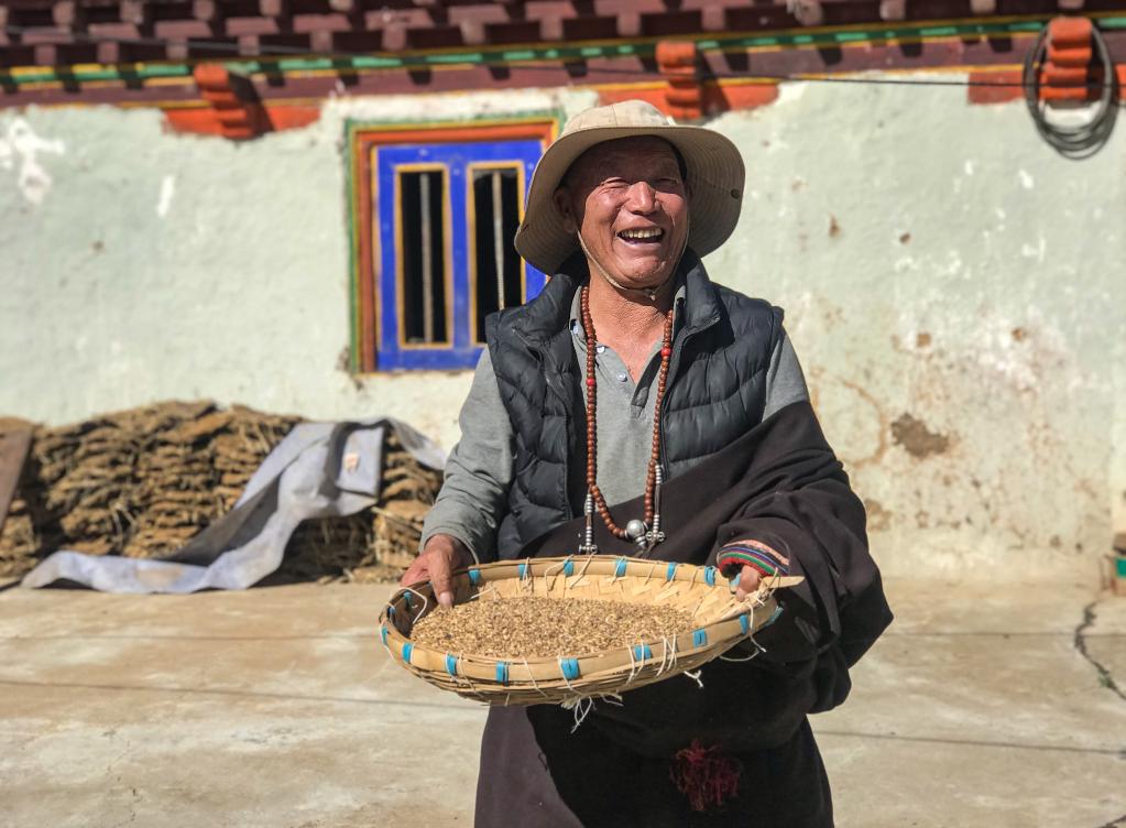 對于洛絨達(dá)瓦一家來說,用青稞粉做成的糌粑,是他們的主要食物。洛絨達(dá)瓦家里有20多畝地,其中有15畝就用來種植青稞,產(chǎn)量在5000斤左右。
