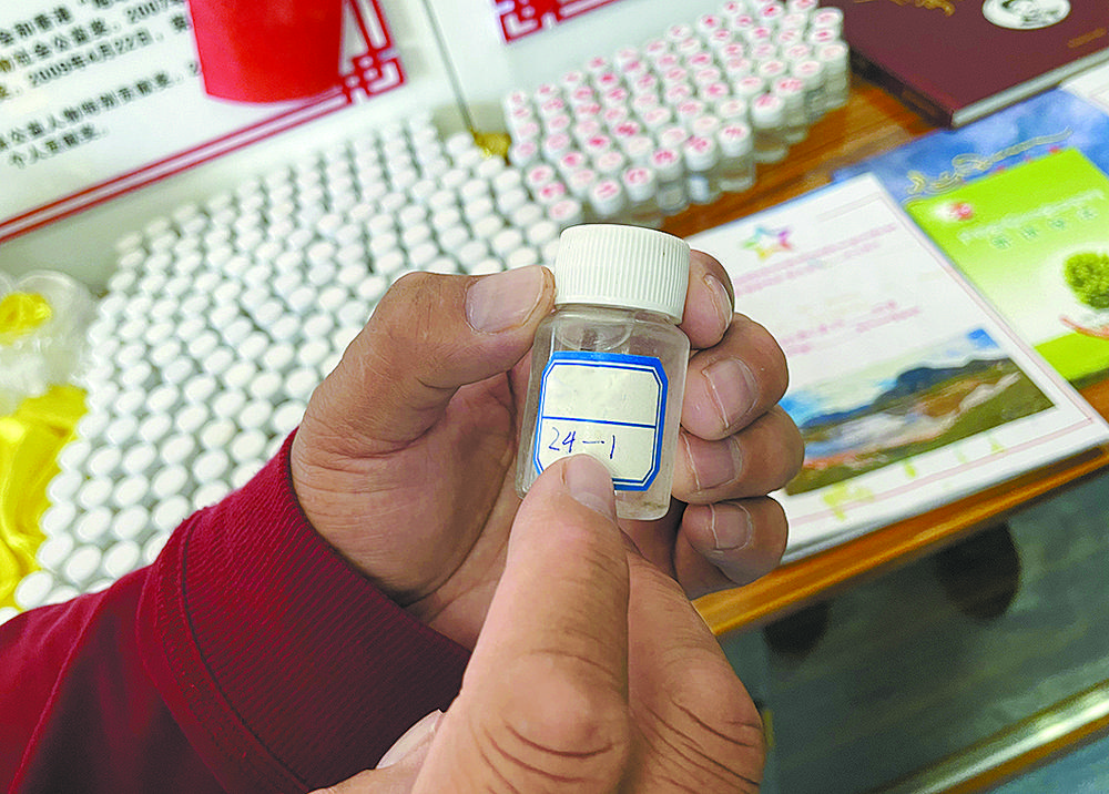 巴洪加羅展示監(jiān)測水源時(shí)所取的水樣。李慶玲 攝