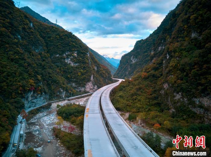 四川平武:九綿高速宛若一條玉帶 點綴五彩斑斕的滿山彩林