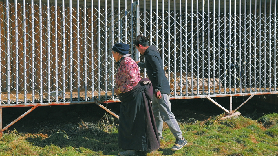 “在巖壁下發(fā)現(xiàn)了它,因?yàn)榱餮^多已經(jīng)奄奄一息了。它的一個(gè)前肢斷了,現(xiàn)在走路還是一瘸一拐的?!蓖瑸樽o(hù)林員的根呷介紹,當(dāng)時(shí)這只雪豹在同另外一只雪豹搶食落敗后受傷,因?yàn)檎孢_(dá)鄉(xiāng)尚未建立動(dòng)物救助中心,雪豹便寄養(yǎng)在甲它家中。鄉(xiāng)政府出資修建了雪豹居住的“鐵籠”,甲它負(fù)責(zé)給它喂食,甲它的妻子則每隔一段時(shí)間就要為這頭猛獸打掃一次圈舍。