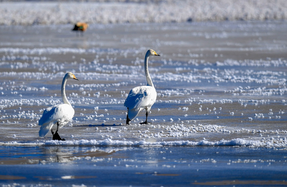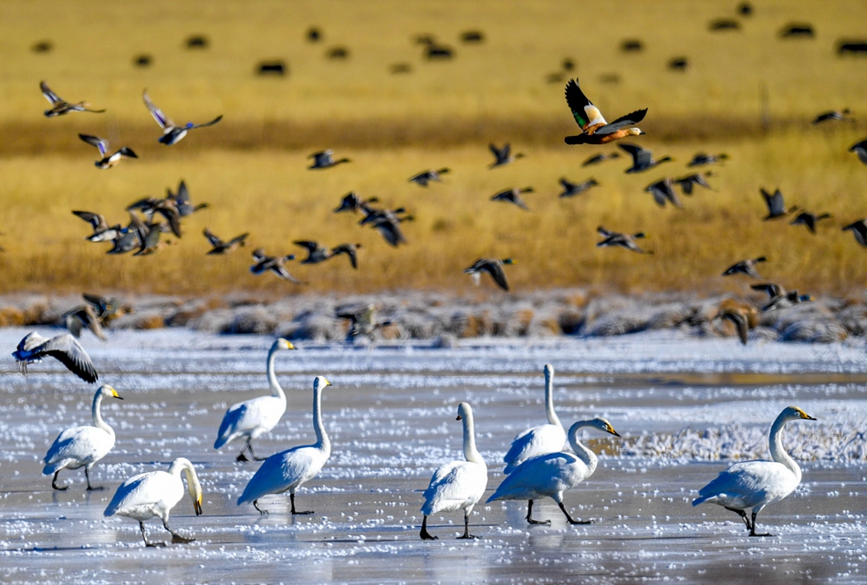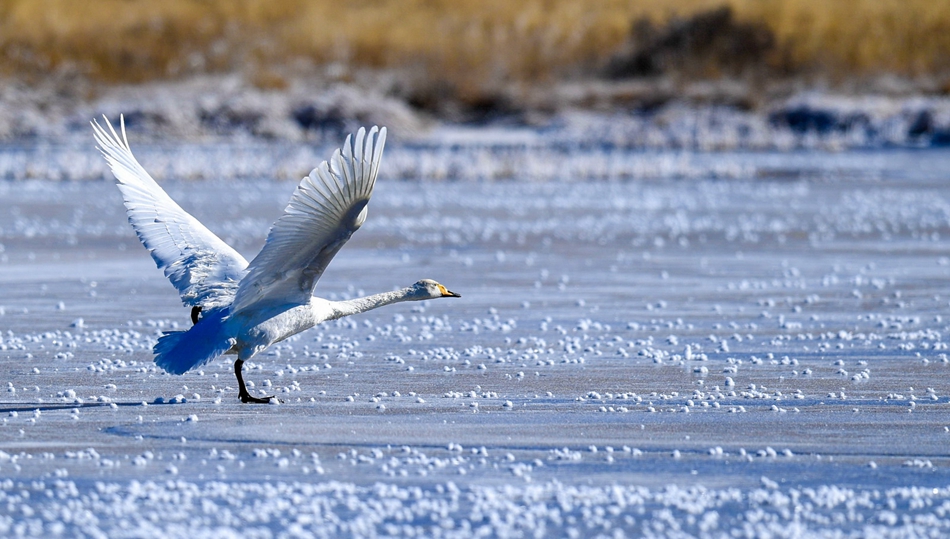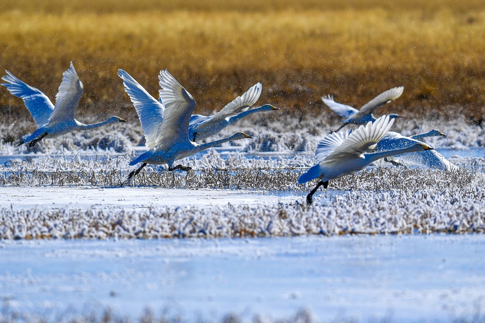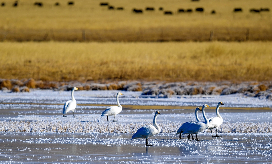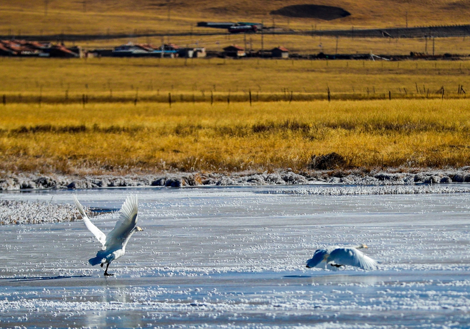 入冬以來(lái),甘肅省甘南藏族自治州碌曲縣尕海濕地越冬的大天鵝浴雪歡歌,翩翩起舞,成為草原上一道獨(dú)特的風(fēng)景。