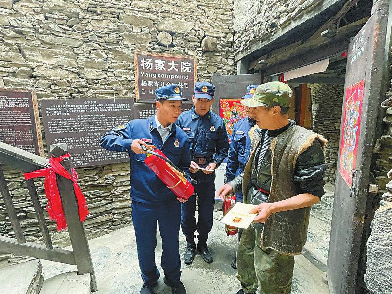 在被譽為“羌族建筑藝術(shù)活化石”的桃坪羌寨,羌族每家都設(shè)“火塘”,羌寨內(nèi)部采用木材構(gòu)造,稍有不慎極易引發(fā)火災(zāi)。到寨子組織滅火演練、開展防火巡查、宣傳消防知識、提供便民服務(wù),就成了陳洪橋和戰(zhàn)友們每天雷不打不動的事,“一定要注意用火用電!”“老鄉(xiāng),請記得‘人走火滅’哦!”“你好,需要幫助嗎?”……這是他們每天不厭其煩對寨中群眾和游客重復(fù)最多的話。寨中每一條疏散通道、每一條暗溝水渠以及每一家房子結(jié)構(gòu)布局,消防員們都了然于胸、爛熟于心。