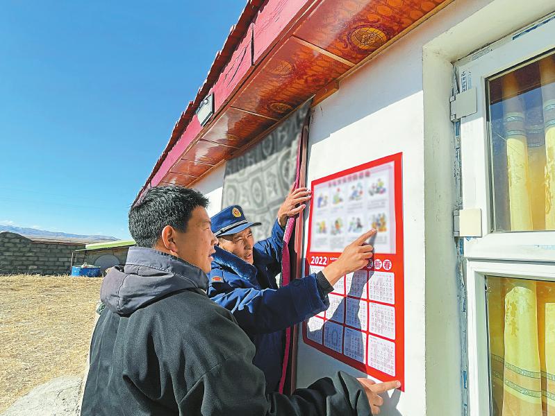 若爾蓋草原。清晨的薄霧還沒有散去,藏族群眾的房屋頂升起陣陣炊煙。一臺紅色的消防車載著五個身穿“火焰藍”制服的消防員,行駛在草原的公路上。這一天,若爾蓋縣消防救援大隊唐克鎮(zhèn)政府專職消防站的隊員們,要到10多公里外的牧民定居點開展草原防火宣傳。