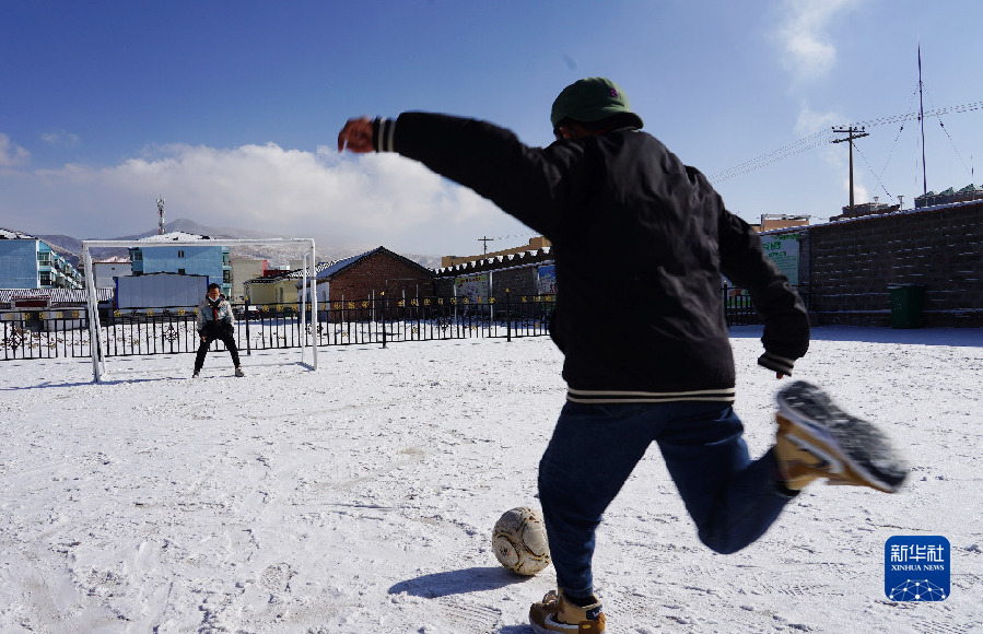 在青海省果洛藏族自治州瑪多縣地震災后過渡安置一校區(qū)操場,孩子們在踢足球(12月18日攝)。