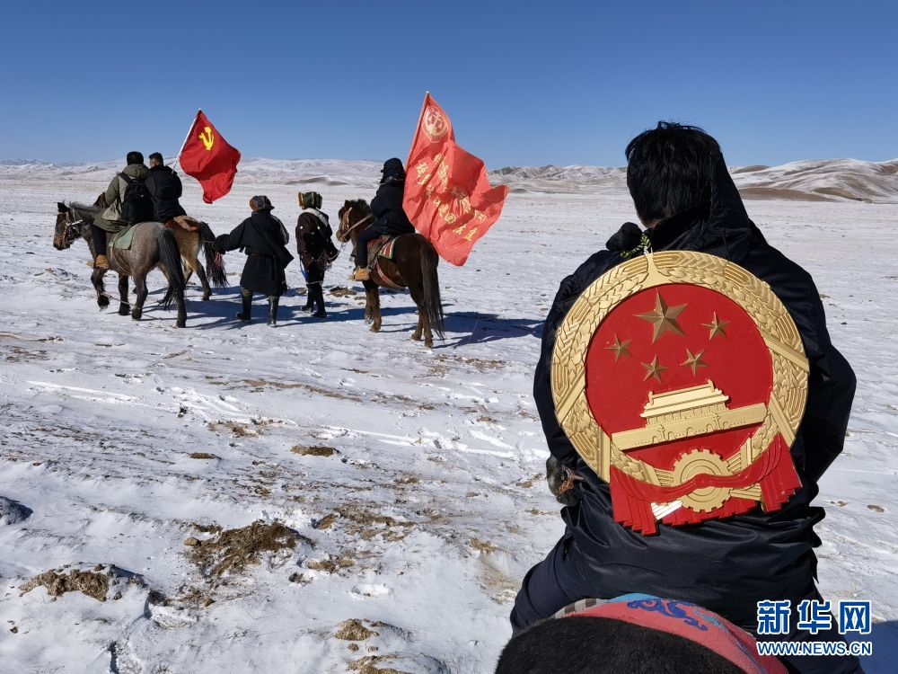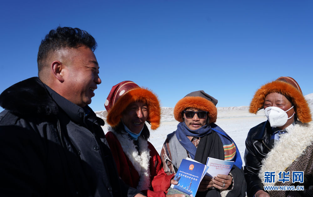 12月20日,青海省果洛藏族自治州瑪多縣人民法院院長錢快乾(左一)在雪后草原上為當(dāng)?shù)啬羺^(qū)群眾普及法律知識。新華社記者 李寧 攝