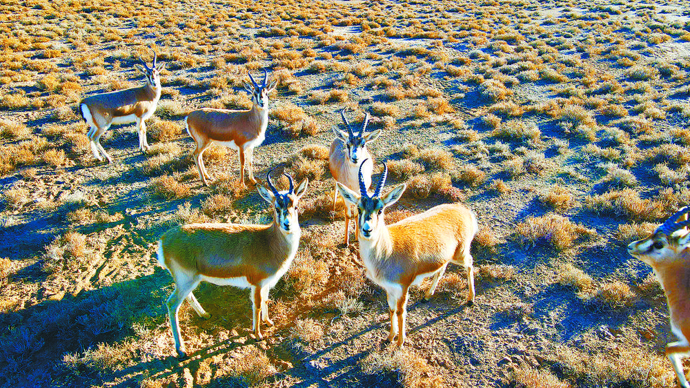 近日,海西蒙古族藏族自治州當(dāng)?shù)財(cái)z影愛好者在祁連山國家公園德令哈片區(qū)拍攝到結(jié)伴覓食的珍稀野生動物——鵝喉羚。鵝喉羚屬典型的荒漠、半荒漠區(qū)域生存的動物,體型似黃羊,因雄性在發(fā)情期喉部肥大,狀如鵝喉,故得名“鵝喉羚”。