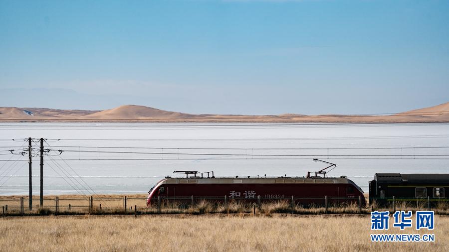列車從青海湖畔緩緩駛過(guò)。新華網(wǎng) 宋忠勇 攝
