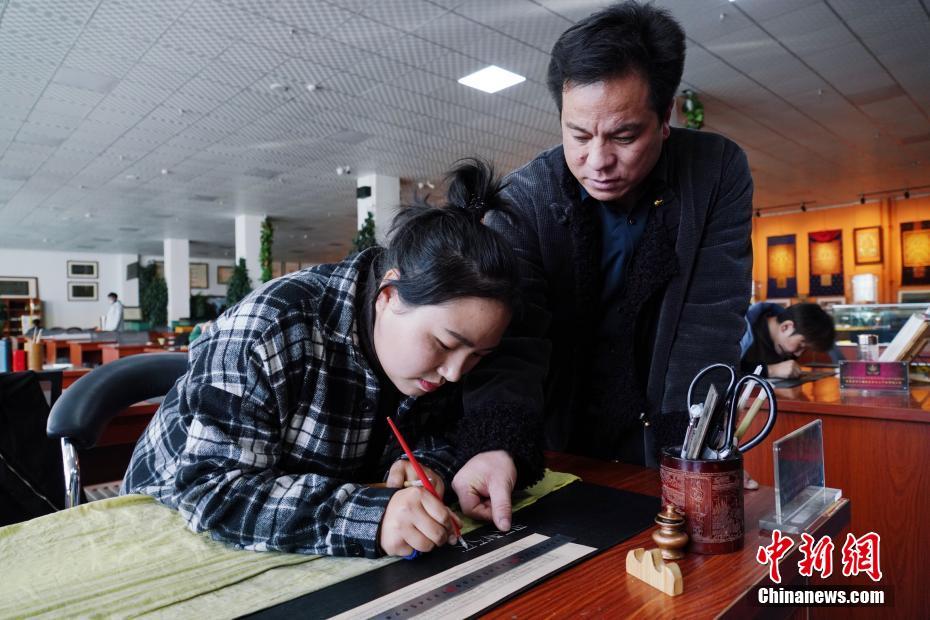 1月18日,青海省黃南藏族自治州尖扎縣非物質(zhì)文化遺產(chǎn)綜合傳習(xí)中心負(fù)責(zé)人才讓多杰(右)向?qū)W員講解經(jīng)文的書(shū)寫(xiě)格式。該中心現(xiàn)有50名學(xué)員學(xué)習(xí)藏文書(shū)寫(xiě)、唐卡繪制、藏紙手工制作技藝等。他們?cè)趯W(xué)習(xí)、了解豐富多彩的藏族文化知識(shí)外,每年還可增收近5萬(wàn)元人民幣。中新社記者 馬銘言 攝