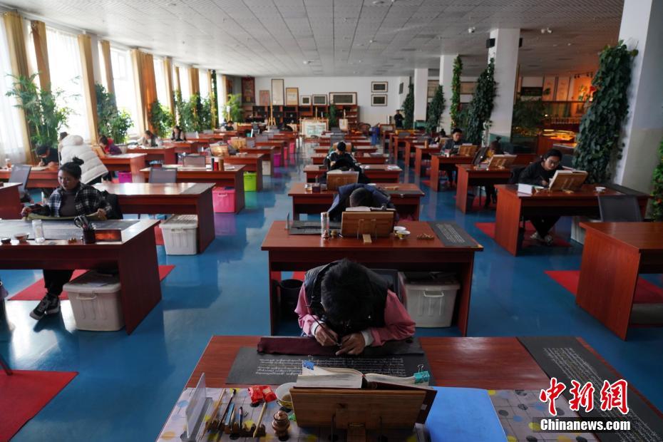 1月18日,青海省黃南藏族自治州尖扎縣非物質(zhì)文化遺產(chǎn)綜合傳習(xí)中心內(nèi),學(xué)員們正在抄寫(xiě)經(jīng)文。該中心現(xiàn)有50名學(xué)員學(xué)習(xí)藏文書(shū)寫(xiě)、唐卡繪制、藏紙手工制作技藝等。他們?cè)趯W(xué)習(xí)、了解豐富多彩的藏族文化知識(shí)外,每年還可增收近5萬(wàn)元人民幣。中新社記者 馬銘言 攝
