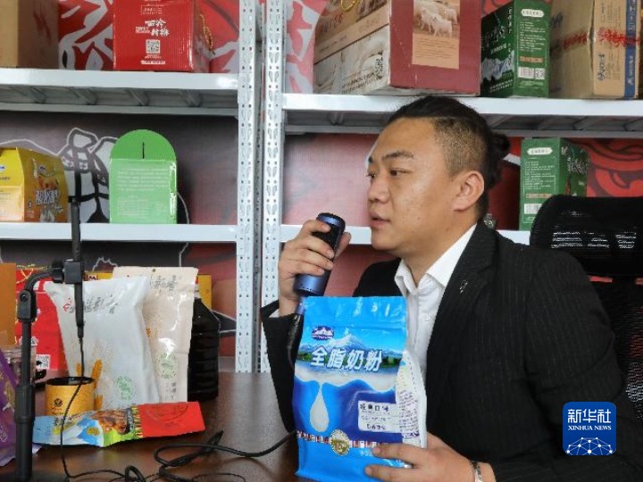 1月25日,網(wǎng)絡(luò)主播騰格爾在直播間為粉絲們介紹來自家鄉(xiāng)的農(nóng)畜產(chǎn)品。新華社 央秀達珍 攝