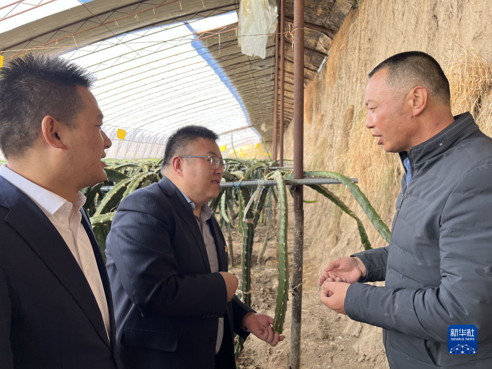 2月24日,郭存海(右)向銀行工作人員介紹火龍果生長情況。新華社記者 解統強 攝