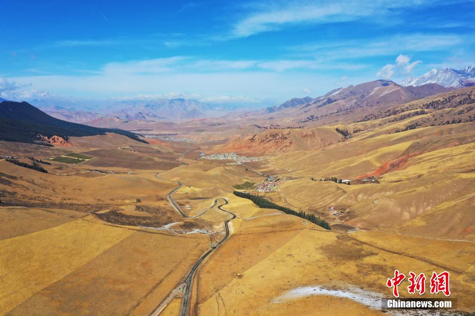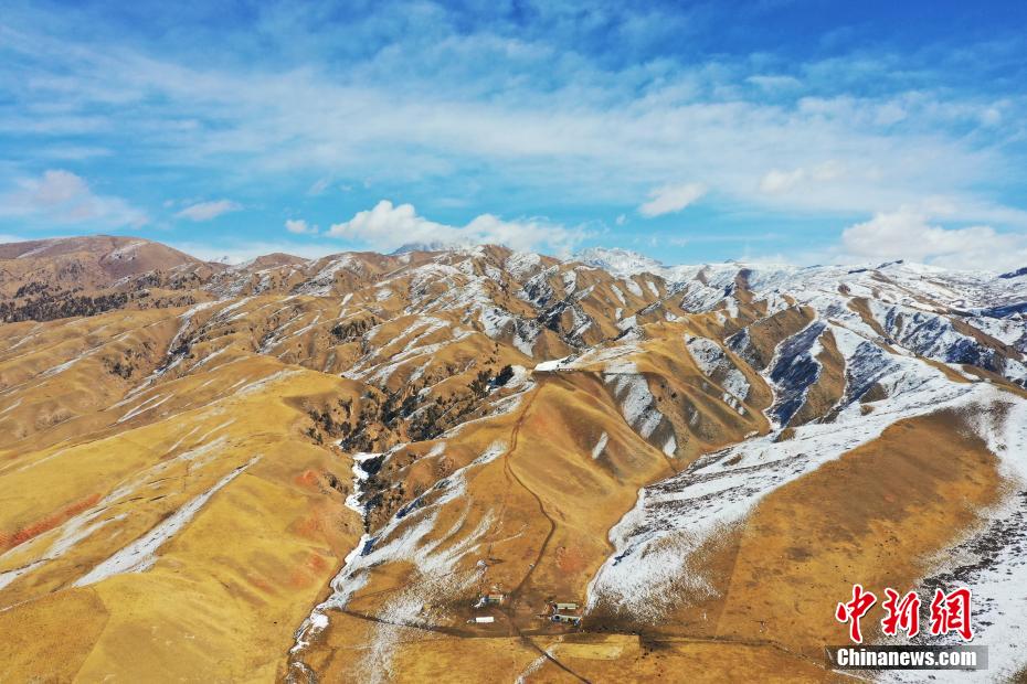 一場(chǎng)春雪過后,青海省海北藏族自治州祁連山國(guó)家公園青海片區(qū)群山被白雪覆蓋,云霧繚繞,金色的草場(chǎng)、潔白的羊群和蔚藍(lán)的天空相映成趣,美不勝收。馬銘言 攝
