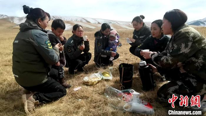 在巡護(hù)了一大片林地后,大家聚到一起休息。草原上席地而坐,背著11個(gè)月大女兒的索南吉放下孩子,小扎西拿著風(fēng)鈴逗著妹妹。一壺清茶、一袋干糧、兩個(gè)孩子,一群女子交流著巡護(hù)情況,不時(shí)也會(huì)傳出開(kāi)心的笑聲。