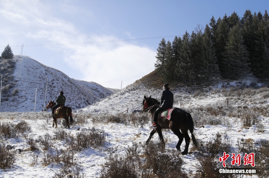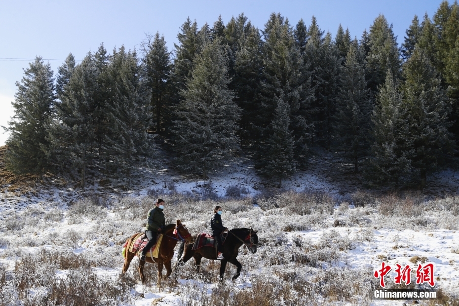 3月17日,位于祁連山腹地的青海省海北藏族自治州祁連縣,女子管護(hù)隊(duì)員們騎馬巡山。 中新社記者 馬銘言 攝