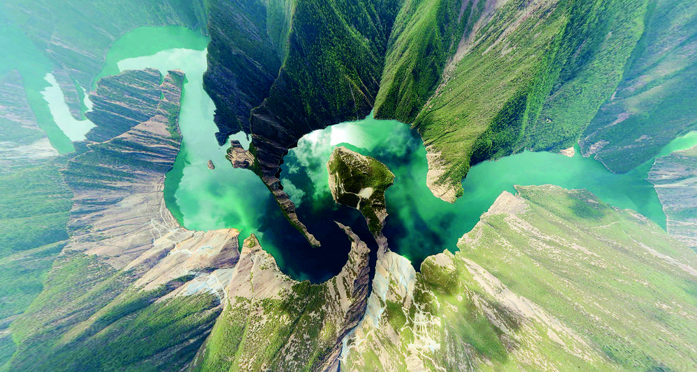 天龍湖是一個(gè)向上的世界,這世界被山水抬舉。記者從最佳視角——位于峽谷核心區(qū)普巴絨鄉(xiāng)比貢寺所在的山脊俯瞰,“九曲回腸”的一灣灣碧水在瘦削相對的青山之間,串連似珠玉,蘊(yùn)翠含黛、峻峭生姿。