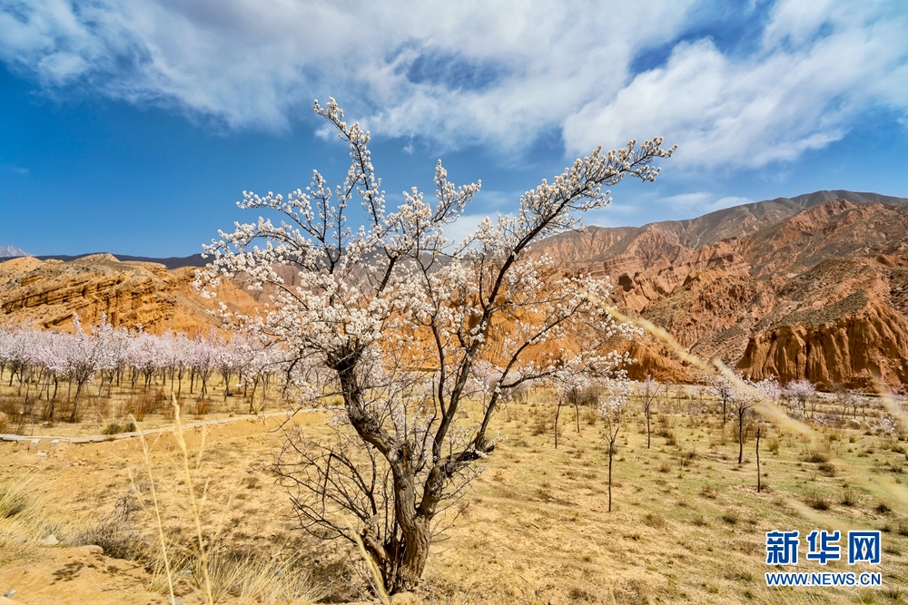 神奇的丹霞峽谷和一樹樹梨花構成一幅色彩艷麗的油畫。新華網(wǎng) 宋忠勇 攝