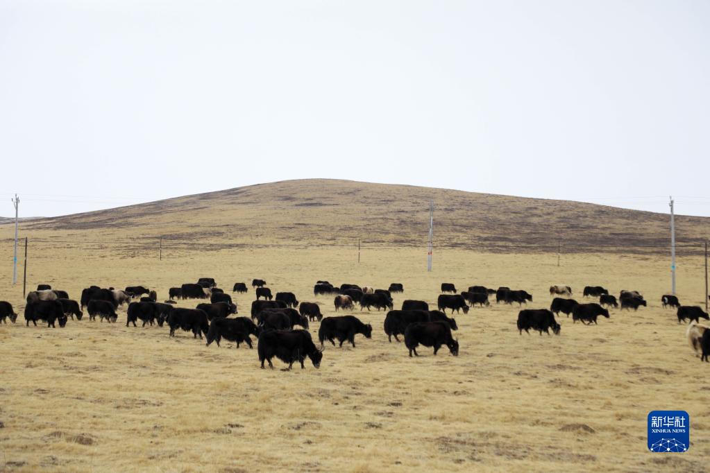 3月31日,青海省黃南藏族自治州河南蒙古族自治縣,一群牦牛在草原上吃草。新華社記者 王艷 攝