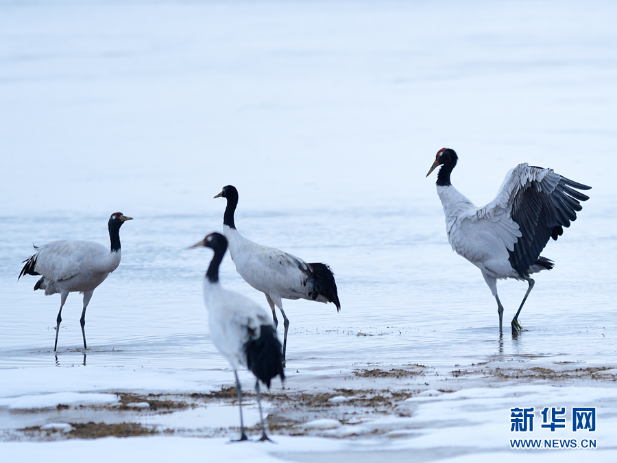 在位于青海省果洛藏族自治州瑪多縣的三江源國家公園黃河源園區(qū)內(nèi),數(shù)只黑頸鶴在此棲息覓食。新華社記者 張龍 攝
