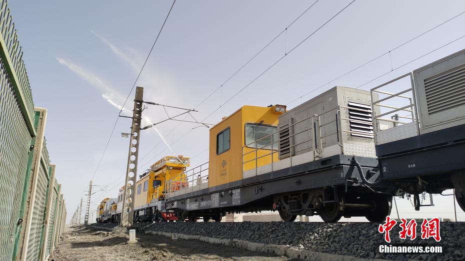 察爾汗鹽湖區(qū)域空氣中鹽分含量高,在這片區(qū)域,春秋季大風(fēng)不僅揚沙還會揚鹽,很容易在鐵路牽引供電接觸網(wǎng)設(shè)備上形成鹽污,造成線路跳閘,遇到雨雪天氣就會放電,造成大面積跳閘,誘發(fā)行車安全事故。圖為接觸網(wǎng)工操作水炮進行清洗作業(yè)。 王文誠 攝