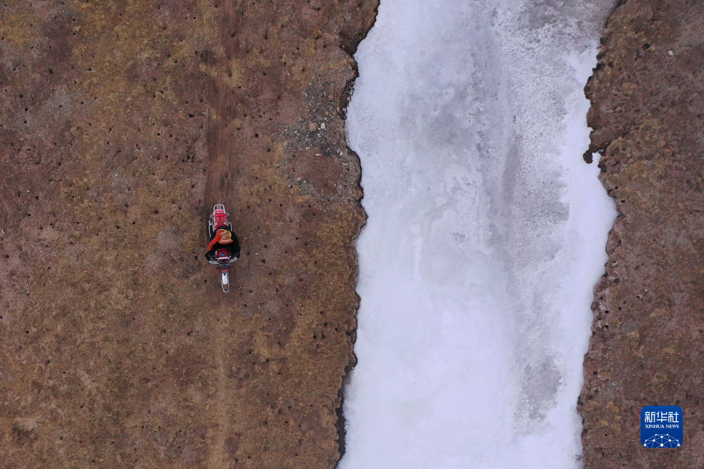 4月21日,在青海省玉樹藏族自治州曲麻萊縣麻多鄉(xiāng)約古宗列曲附近,生態(tài)管護員才仁扎西駕駛摩托車巡護。新華社記者 張龍 攝