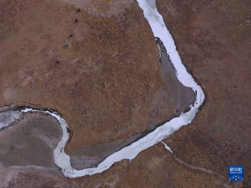 4月21日,在青海省玉樹藏族自治州曲麻萊縣麻多鄉(xiāng)約古宗列曲附近,生態(tài)管護員在巡護(無人機照片)。新華社記者 張龍 攝